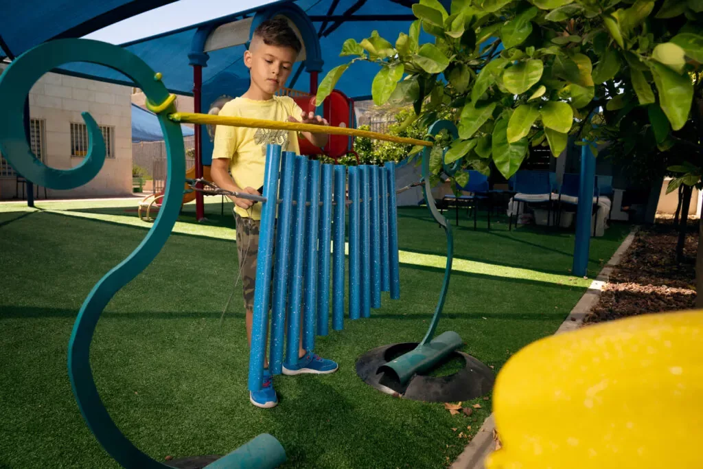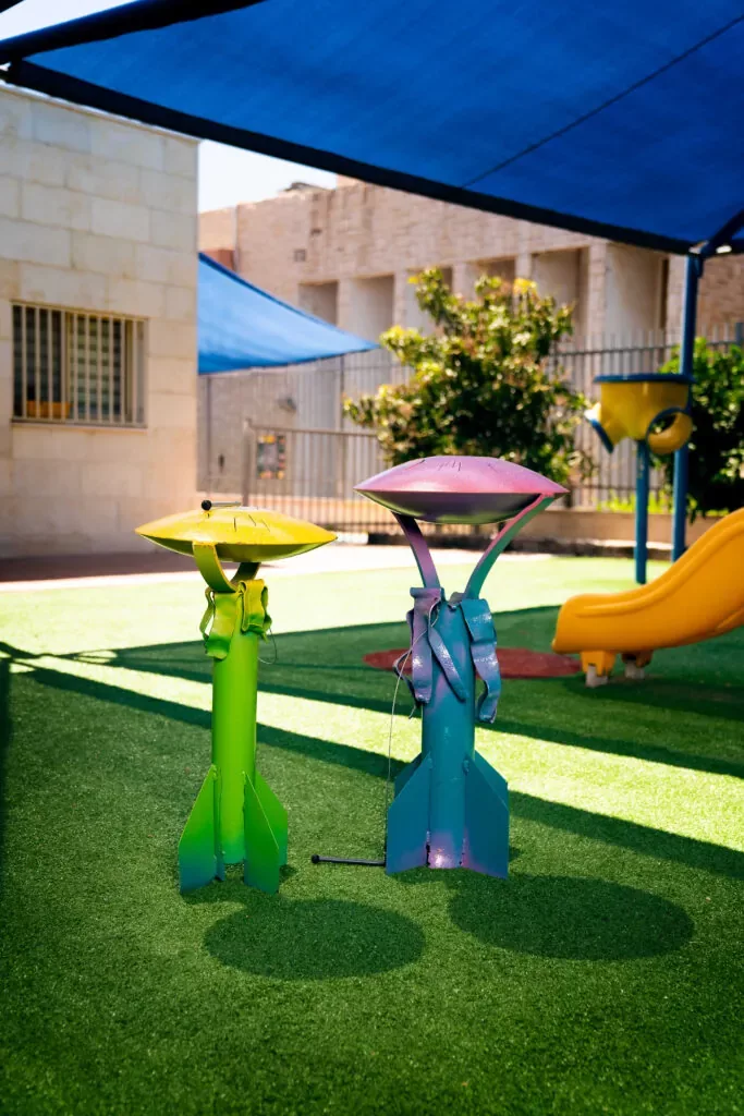 The instruments—including two steel drums, a xylophone and a lyre shaped not unlike the one King David would’ve played (that is specially designed to play the notes to Israel’s national anthem)—were installed in the Hosen Rehab center for PTSD sufferers in Ashkelon. The center offers trauma therapy for free to all the surrounding residents and often engages in preemptive counseling to prepare the more vulnerable sects of society for when they will inevitably come under threat. This made the Hosen center a perfect place to set the brightly-painted weapons-turned-instruments.