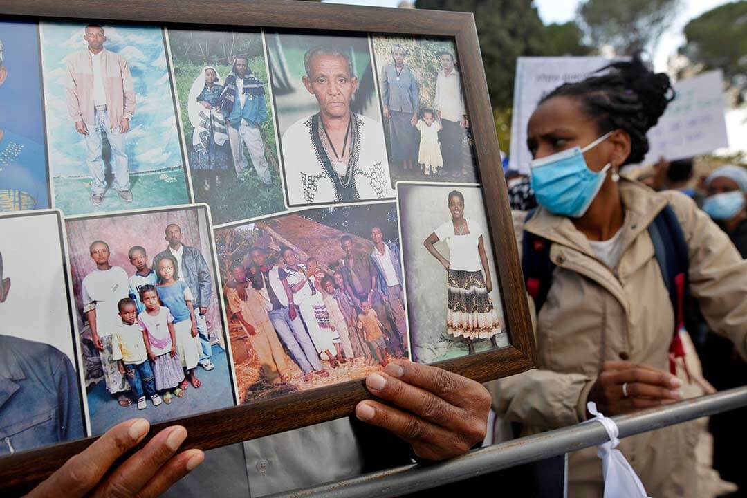 Ethiopian Israelis hold up photographs of their relatives outside the Israeli parliament (Knesset) in Jerusalem in hopes of acquiring permission to bring them to Israel.