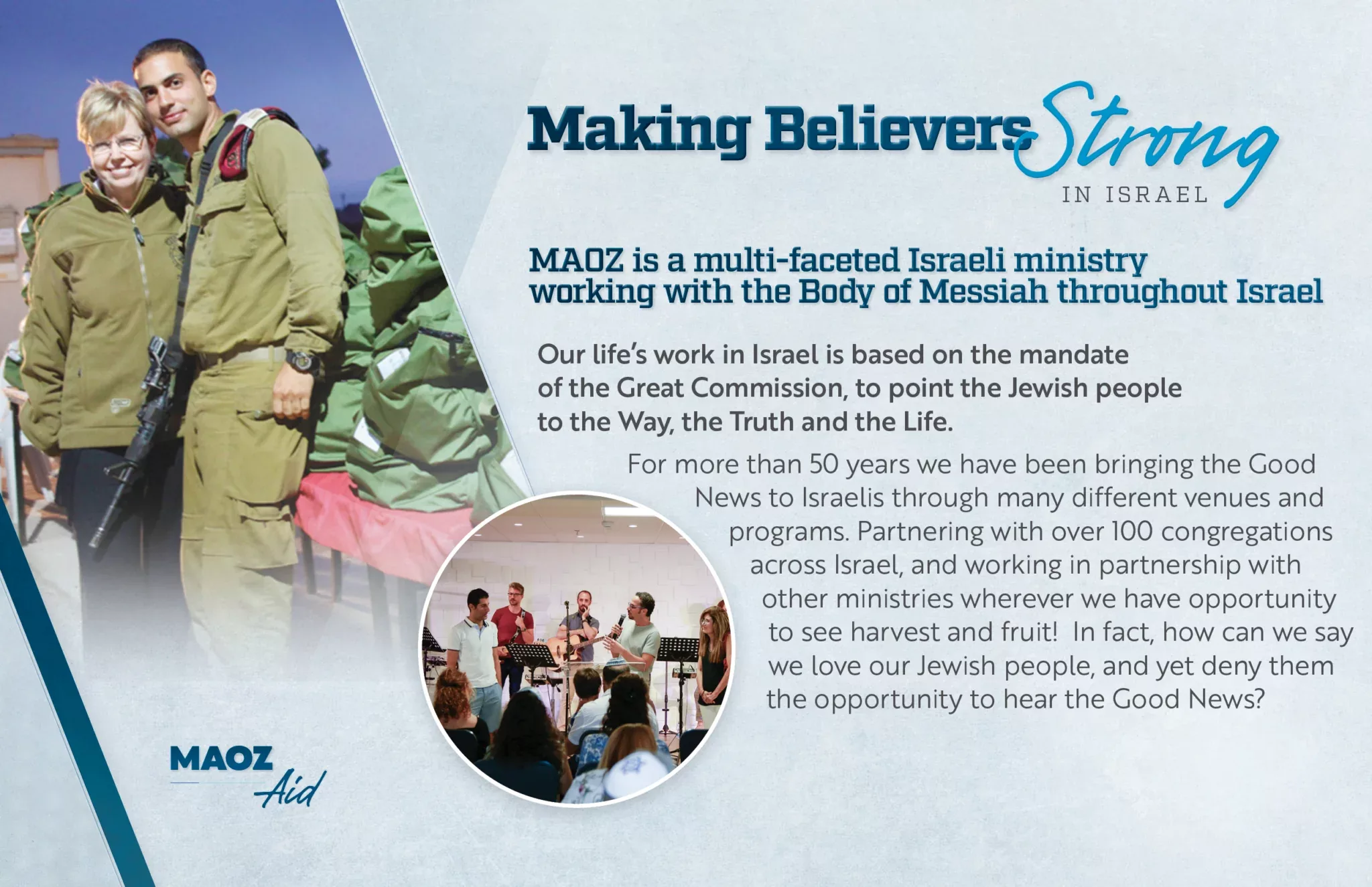 Maoz Israël apporte la vérité de Yeshua aux quatre coins du pays. Votre don équipe les croyants et atteint les perdus ; participez dès aujourd'hui à cette œuvre éternelle.