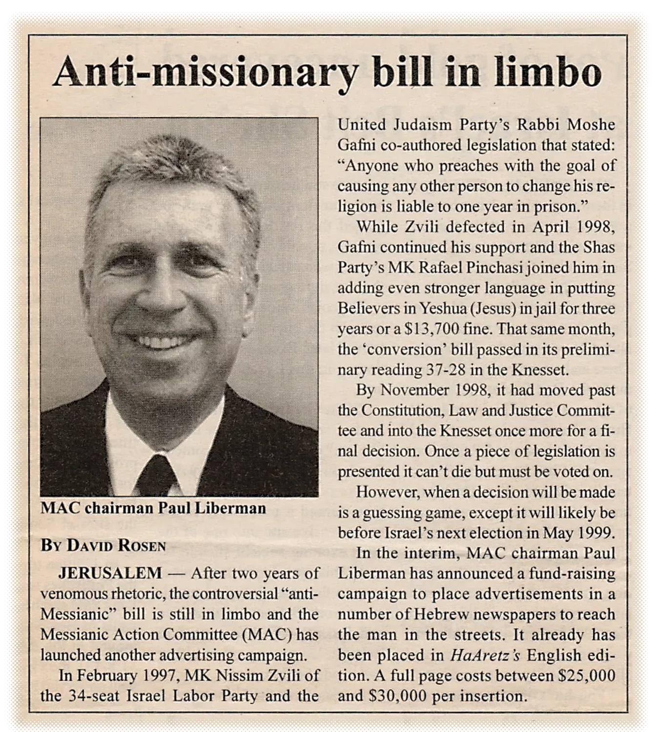 La définition orthodoxe de « matériel missionnaire » désignait tout ce qui propageait le nom du Messie Yeshua. L'article poursuivait : « La nouvelle proposition de loi des députés Nissim Zvilli et Moshe Gafni stipule que quiconque possède, imprime, copie, distribue ou importe des publications contenant une quelconque contrainte à changer de religion est passible d'une peine d'un an de prison. » Là encore, dans leur dictionnaire, « contrainte » pourrait signifier promettre un quelconque bienfait, comme le pardon des péchés par l'expiation du Messie.